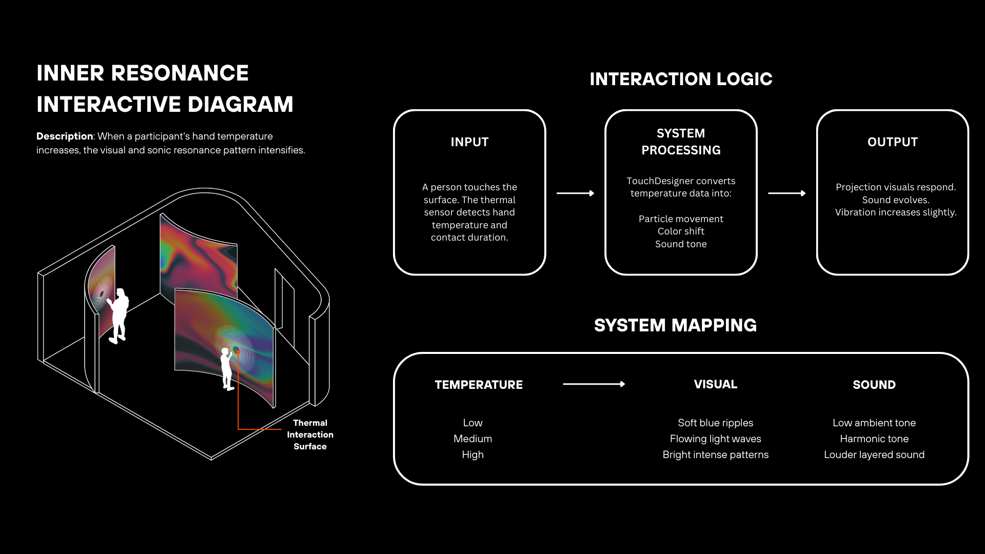 Inner Resonance: where the body becomes part of the system. A thermal camera detects body heat and translates it into light patterns, which then influence the sound being played.