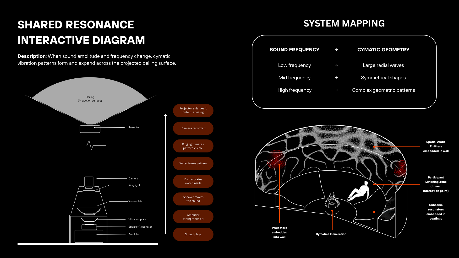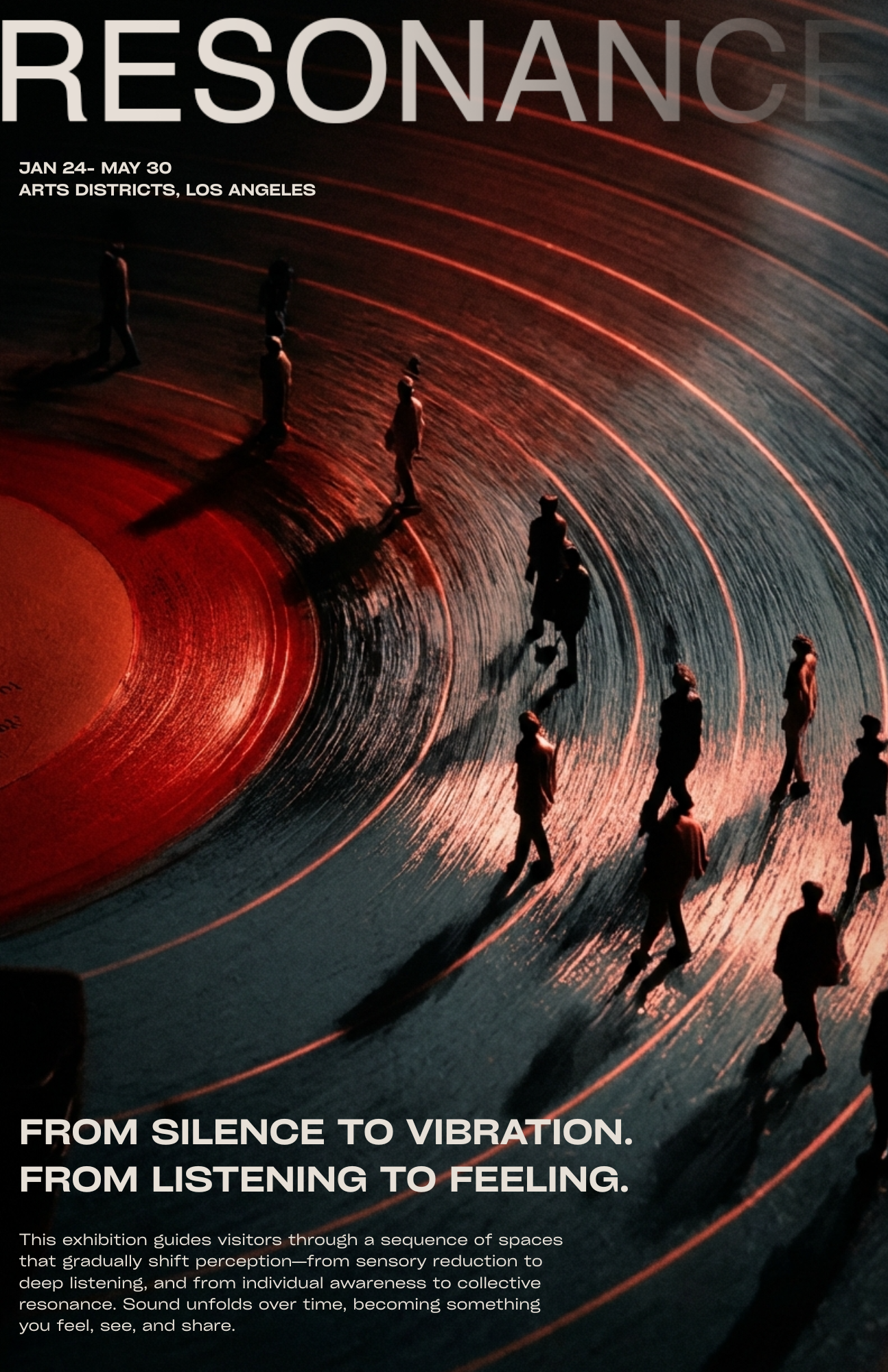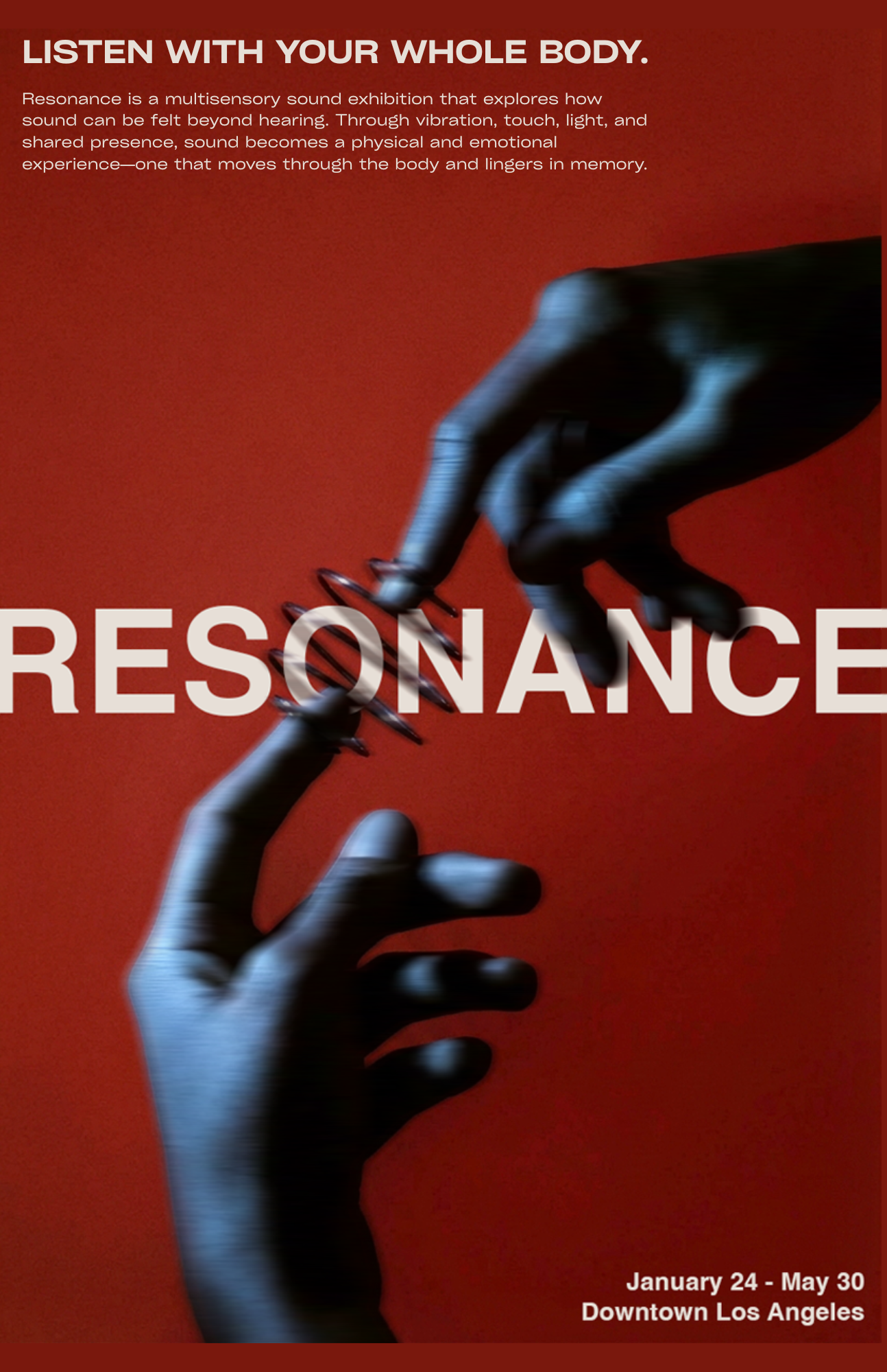 Resonance is a multisensory sound exhibition that explores how sound can be experienced through the whole body. Through vibration, touch, light, and shared presence, sound becomes a physical and emotional experience.