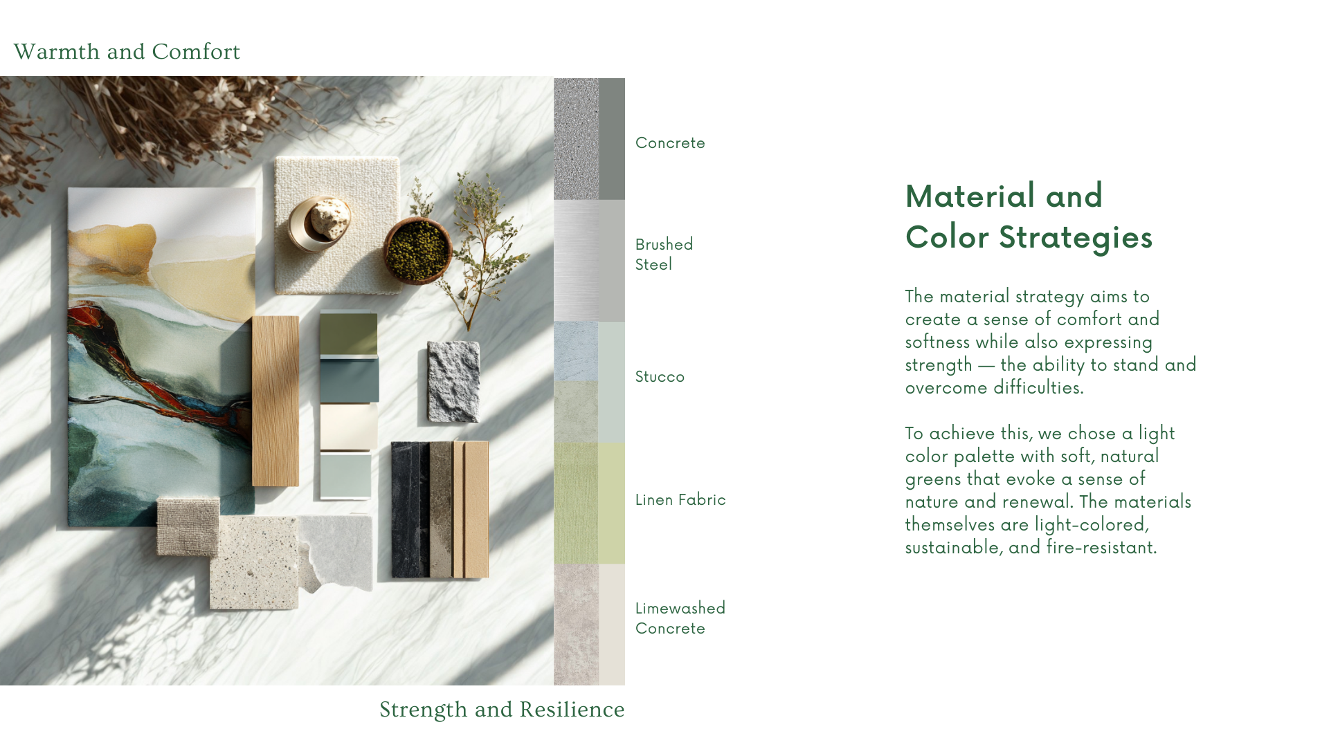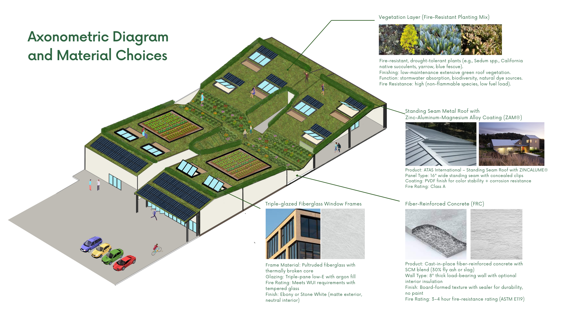 Healing is achieved through a close relationship with the landscape, using topography, outdoor gardens, and a bioswale system to ground the space and support emotional restoration. Resilience is embedded through fire-resistant materials, green roof systems, and self-sufficient design approaches that respond directly to wildfire conditions. Community connection is fostered through open circulation, shared communal spaces, and strong indoor–outdoor relationships that encourage interaction, visibility, and collective support.