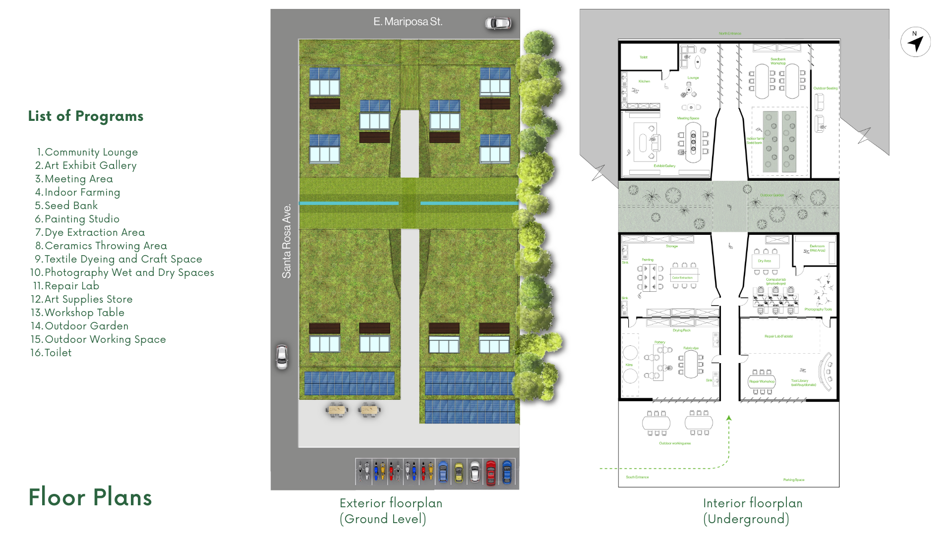 The floor plan is organized around a central garden that acts as both the physical and emotional heart of The Nest. Circulation paths are intentionally directed inward, guiding visitors and residents through a sequence of artist studios, shared workspaces, and communal zones before converging at the garden. This inward movement reinforces a sense of refuge—drawing people away from the surrounding landscape shaped by wildfire toward a protected, restorative core.