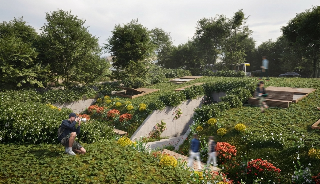 Bioswale and water filtration system. A section detail showing multi-layered filtration through native plants, sand, and gravel, collecting and reusing stormwater for on-site irrigation.