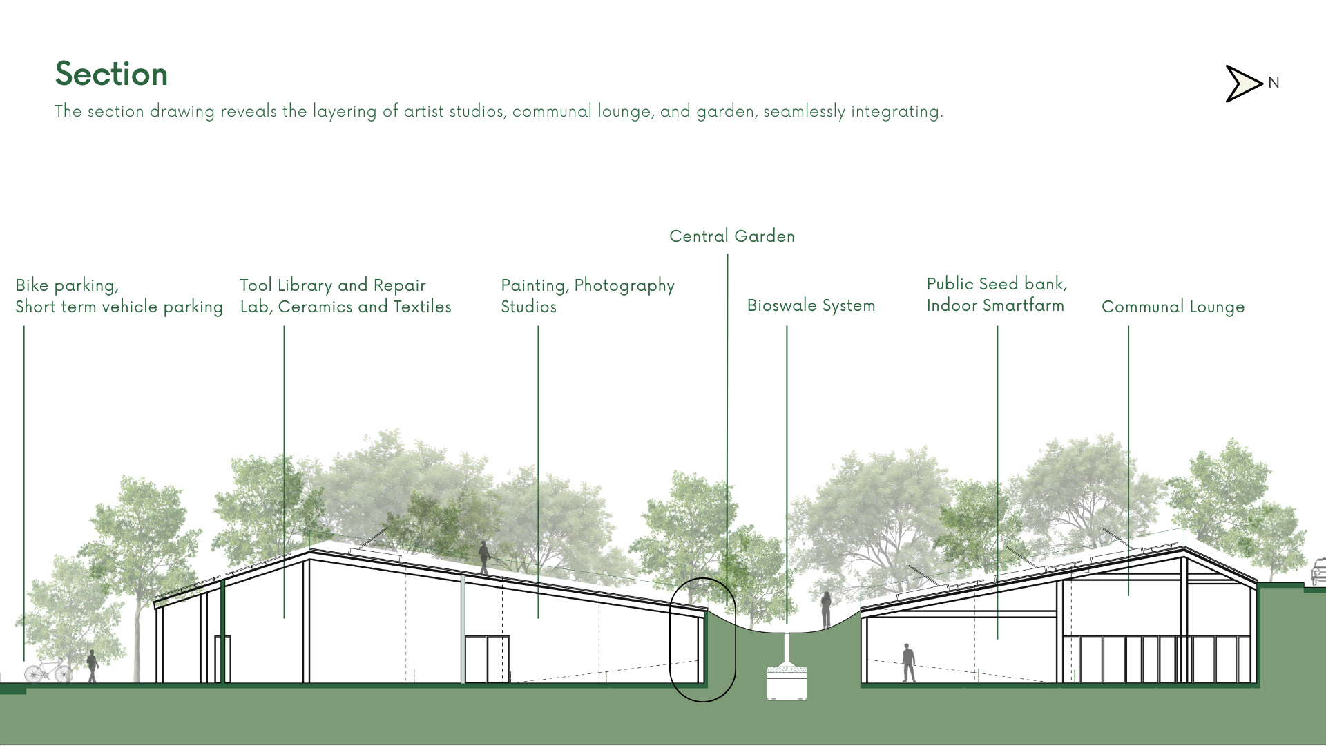 The section illustrates the layered relationship among artist studios, a communal lounge, and a central garden, revealing how topography and circulation integrate indoor and outdoor spaces.